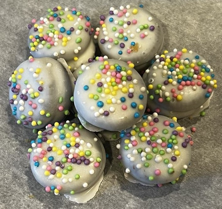 Indulge in our chocolate-coated mini Oreo cookies, available with or without sprinkles. Each package sold contains 3-ounces of irresistible deliciousness.