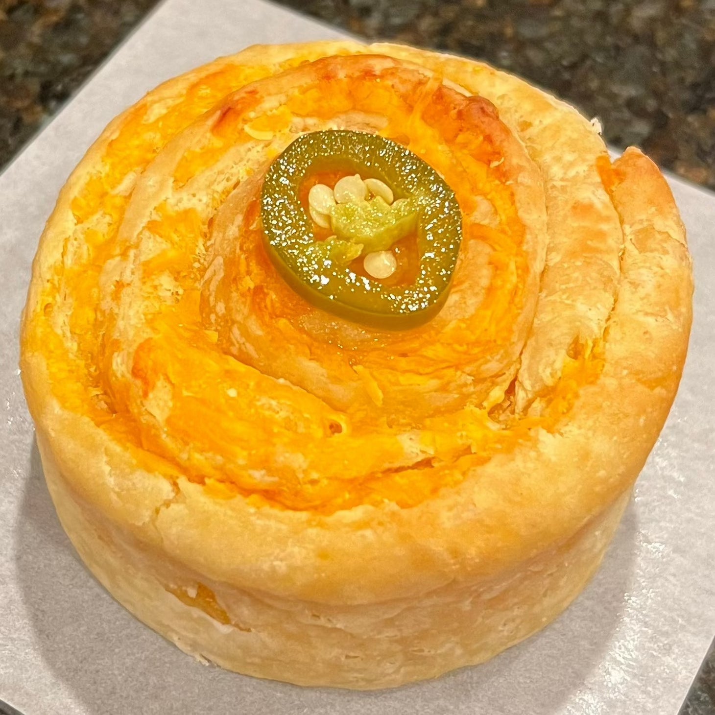 Ingredients: Flour, butter, milk, cheddar cheese, jalapeño, sugar, yeast, salt.